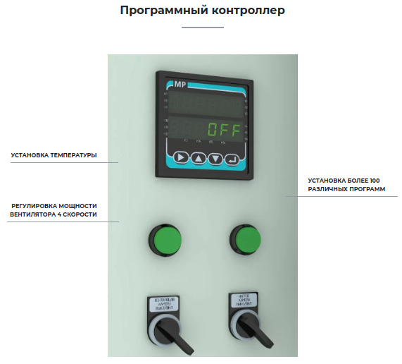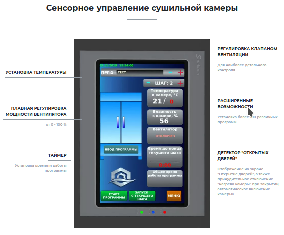 С помощью контроллера настраиваются отдельные этапы сушки с нужными по технологии параметрами температуры и влажности воздуха в сушильном шкафу.
