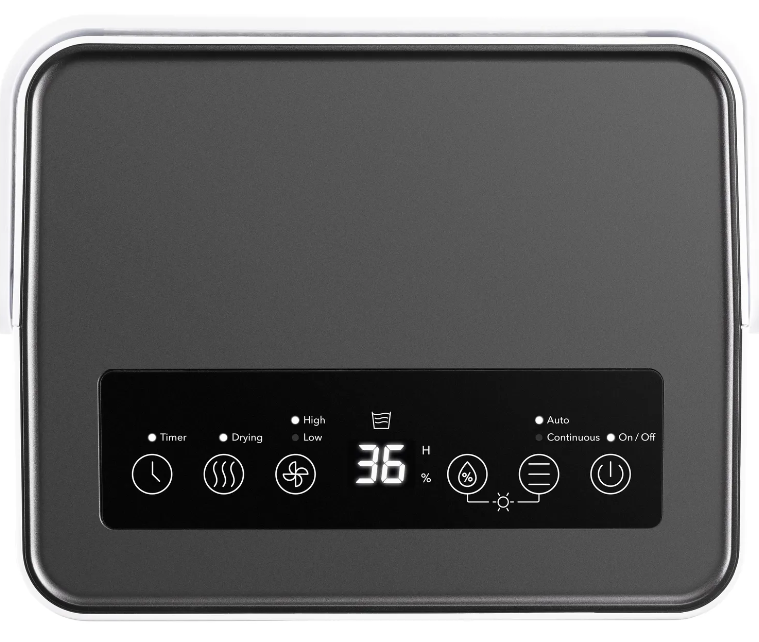 - Cегментный дисплей с подсветкой на панели управления предоставляет точную информацию в процентах об уровне текущей влажности, установленной целевой влажности и часах работы по таймеру на 1-24 часа для включения или выключения по времени.