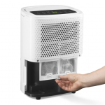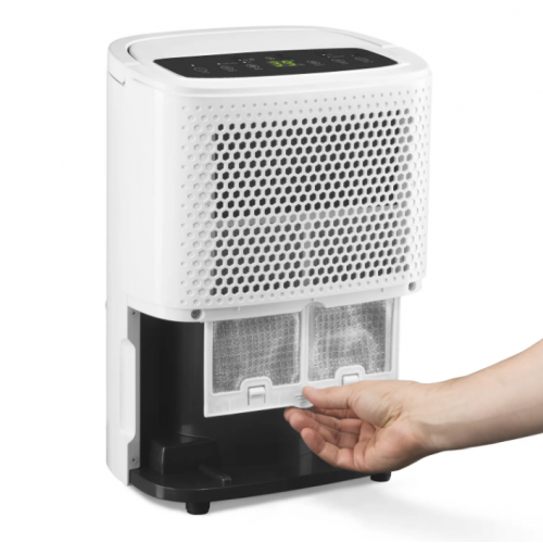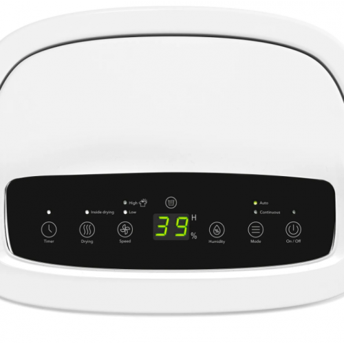 На верхней грани устройства находится черная сенсорная панель с понятными кнопками и LED-дисплеем. С помощью кнопок можно выбрать режим - непрерывного или автоматического осушения, высокую и низкую скорость вентилятора, задать задержку на включение или отключение осушителя, настроить нужный уровень влажности воздуха.