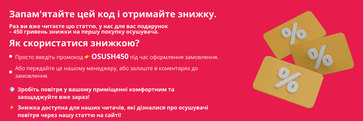 Осушувач ефективно видаляє вологу в закритій кімнаті, без провітрювання та нагрівання повітря до високих температур. Перед його роботою необхідно приставити ближче до місця, де видно патьоки води, максимально впритул.