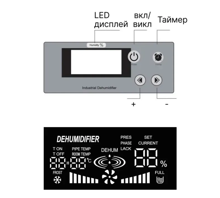 Для керування та налаштування режимів на верхній грані осушувача є зручна та проста сенсорна панель.