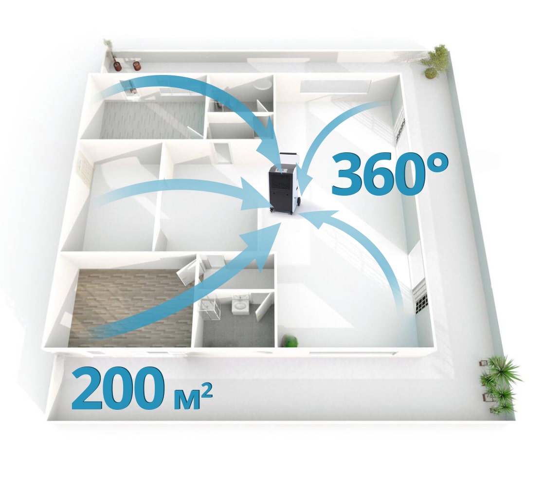 - Вражаюча здатність осушення. Можна застосовувати для великих суміжних приміщень, осушки кількох кімнат або одного великого простору.