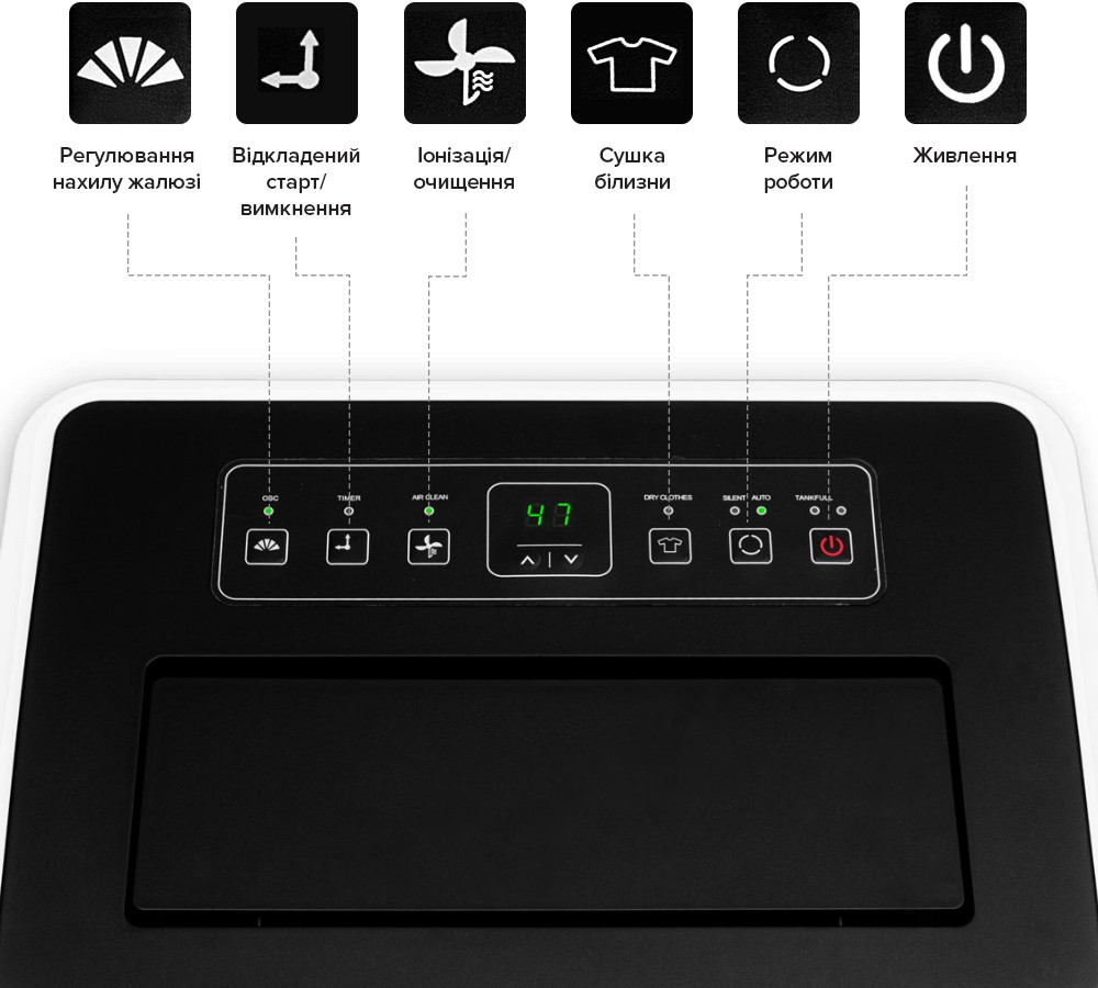 - Mode (режим роботи) – перемикає режими роботи в наступному порядку: Автоматичний режим – Безшумний режим – Інтенсивний – Безперервне осушення.