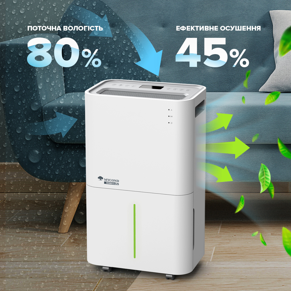 MYCOND Roomer Eco 25 - новий, найпродуктивніший представник популярної лінійки побутових осушувачів Roomer від британського бренду. Ця модель економно і швидко знизить рівень вологості повітря до безпечних та комфортних меж, не дасть розвиватися цвілі та усуне грибок.