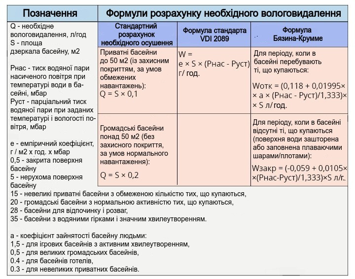 Обчислення потужності апарату, якому належить працювати в конкретному басейні, виконується за результатами розрахунку інтенсивності випарів в приміщенні. Для цього використовуються спеціальні формули.