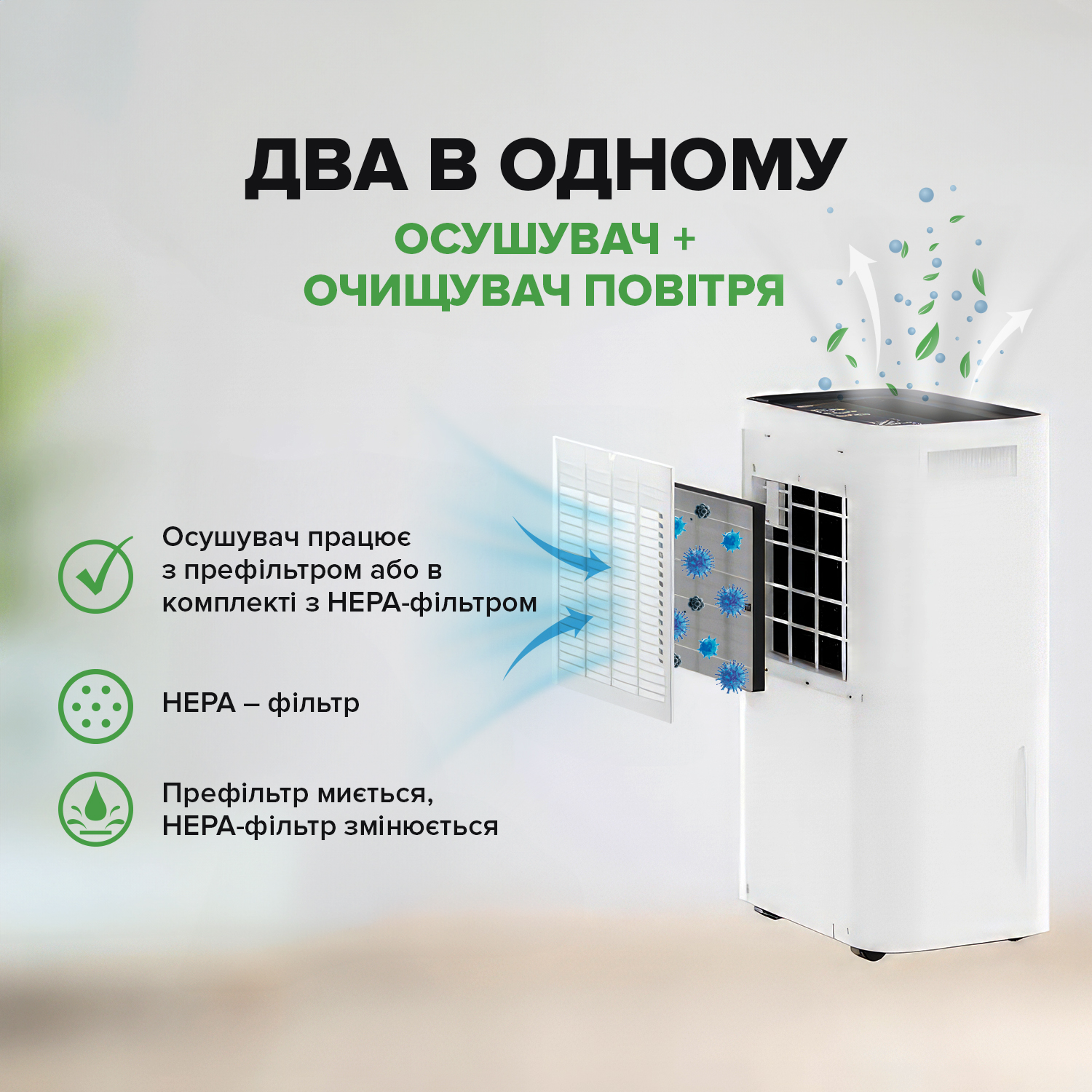 - 2 в одном: осушитель и очиститель воздуха.