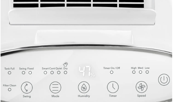 Панель управления – с элегантным дизайном и понятными сенсорными кнопками и цифровым дисплеем. На дисплее видно текущее значение относительной влажности в комнате, при настройке отображается выбранное значение уровня влажности и количество часов таймера. Есть кнопка и индикаторы выбора скорости вентилятора, и включение режима Swing для жалюзи. Имеются индикаторы наполнения бака и состояния загрязненности фильтра.