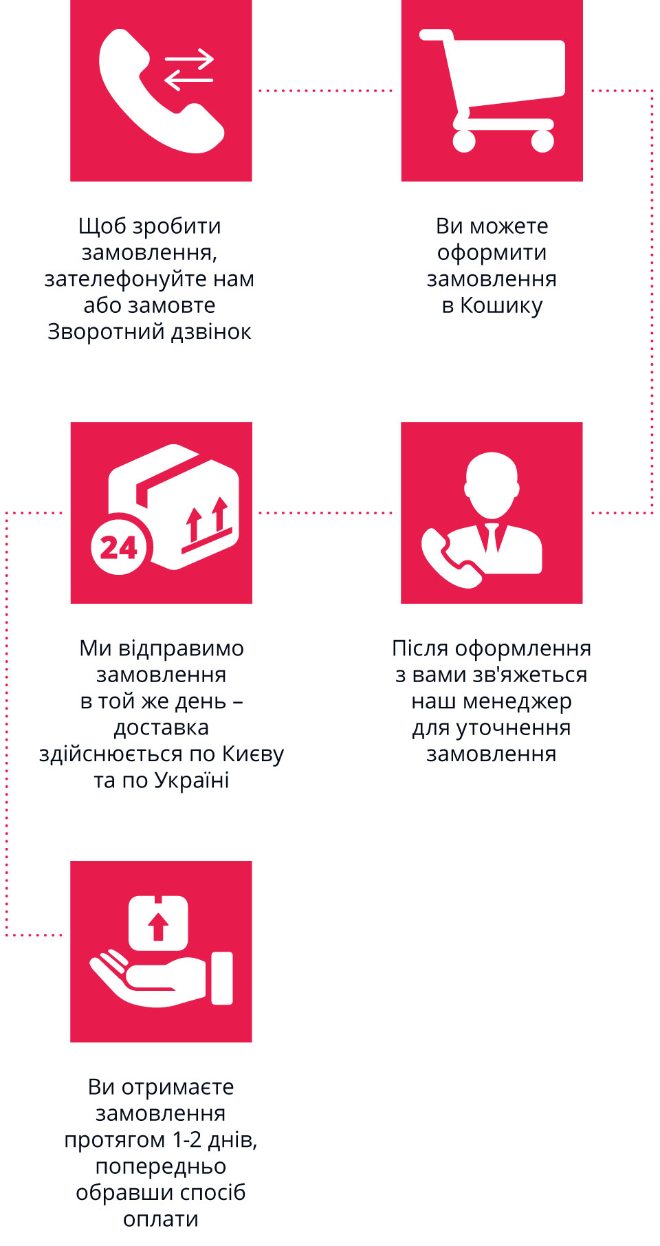 Доставка Україною: Відправка замовлень до відділення логістичної компанії відбувається в день замовлення, якщо вона оформлена до 13:00. Термін доставки вантажоперевізником залежить від відстані та становить від 1 до 5 днів.