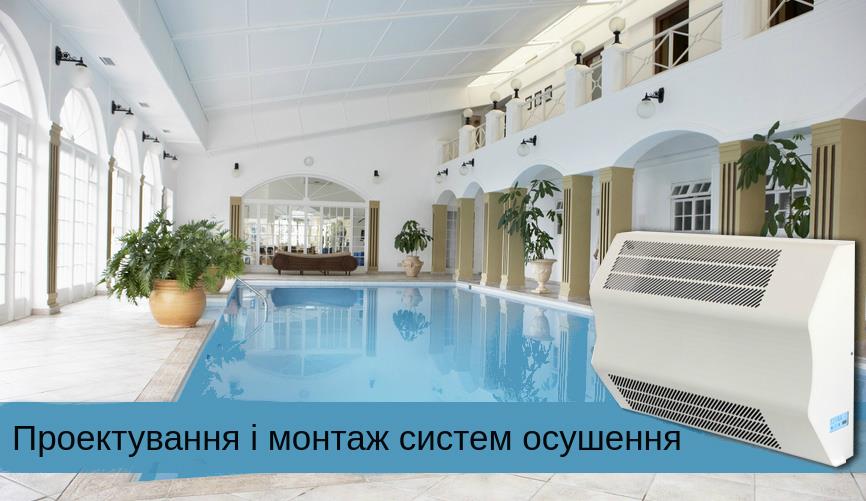 Для ефективного осушення великих приватних або громадських плавальних басейнів і аквапарків рекомендується застосування осушувальних систем, інтегрованих в припливно-витяжну вентиляцію. Установка таких осушувальних систем відбувається по заздалегідь розробленому проекту, оскільки тут необхідно монтувати повітроводи трьох типів: припливні, рекупераційні та витяжні.
